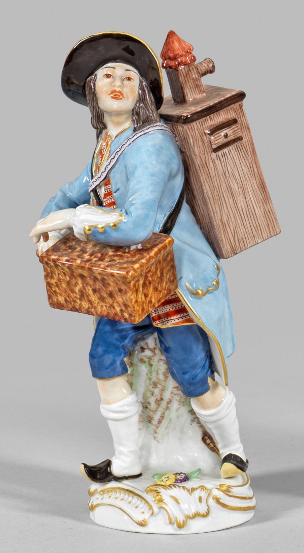 Auf rocaillereliefiertem Sockel stehender, einen Leierkasten spielender Ausrufer, auf dem Rücken einen Guckkasten tragend. Polychrome Malerei mit Goldstaffage. Entw. J. J. Kaendler und P. Reinicke. Modell-Nr. 60242. Schwertermarke. H. 13,5 cm.