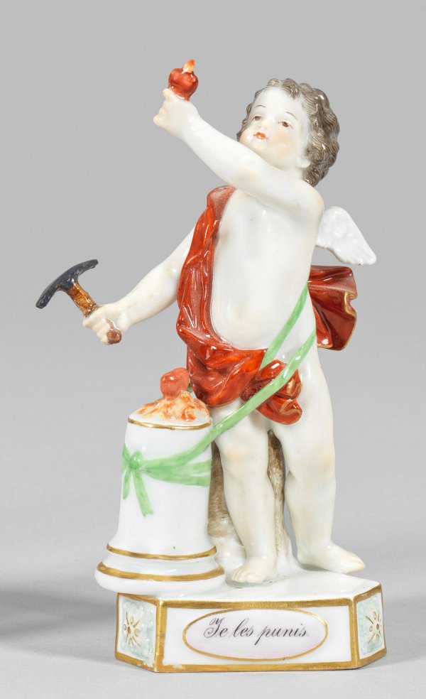 Dreiseitiger Sockel mit Rosetten, bez. "Je les punis". Neben einem Säulenstumpf stehender Putto, mit einem Hammer zwei Herzen zerschlagend. Polychrome Malerei mit Goldkonturierung. Entw. Michel Victor Acier. Modell-Nr. F 6. Unw. rest.; Schwertermarke. H. 14,5 cm.