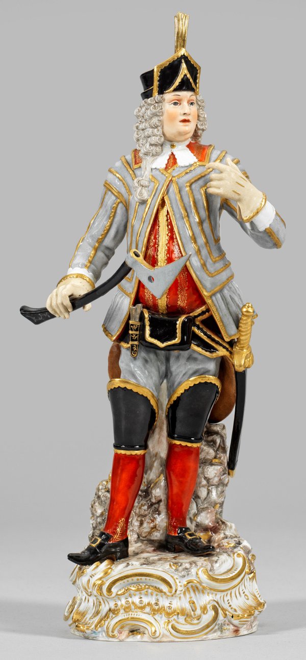 Gehöhter, stark plastisch gestalteter Rocaillesockel. Über felsigem Terrain stehender Bergmann in goldverzierter Paradepracht. Die rechte Hand erhoben, in der Linken eine Barte haltend. Das Haar von einer Allongeperücke und schwarzem Schachthut bedeckt. Um die Hüfte gegürtete Tscherper, Tscherpertasche sowie Degen. Polychrome Malerei mit Goldstaffage. Entw. Paul Helmig, 1896. Modell-Nr. P 188. Unw. rest.; Schwertermarke. H. 33,5 cm.