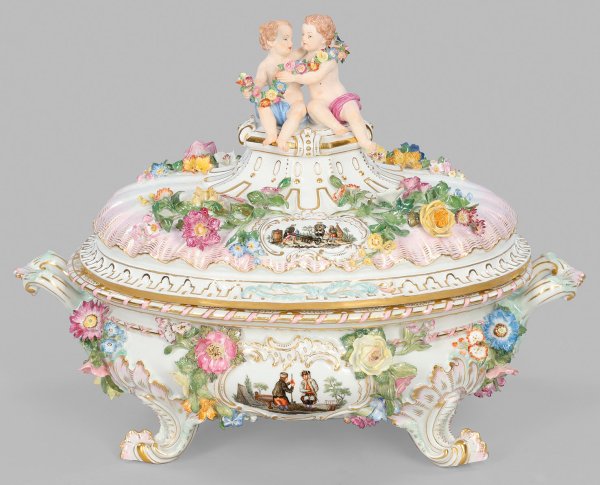 Von vier stark reliefplastischen Rocaillefüßen getragener, gedrückt bauchiger, ovaler Korpus mit profiliertem Rand. Seitliche, herzförmig gebogte Henkel. Aufgewölbter, muschelreliefierter Deckel mit postamentartig aufsteigendem Knauf. Als Bekrönung sitzendes Amorettenpaar mit Blumengirlande. Beidseitig der Wandung und dem Deckel, von üppig aufgelegten Blütenranken umzogene Rocaillekartuschen mit szenischen Darstellungen von Sächsischen Bergleuten vor Hüttenlandschaft zwischen Steinhaufen und Fässern beim Verrichten verschiedener Tätigkeiten. Feine, polychrome Malerei mit reicher Goldstaffage. Umlaufende, reliefierte Zinnen- und Kordelbordüren. Im Spiegel feines Ovalmedaillon aus arabeskem Laub- und Bandelwerk. Unw. rest.; Schwertermarke. H. 29 cm. 37 cm x 23 cm.