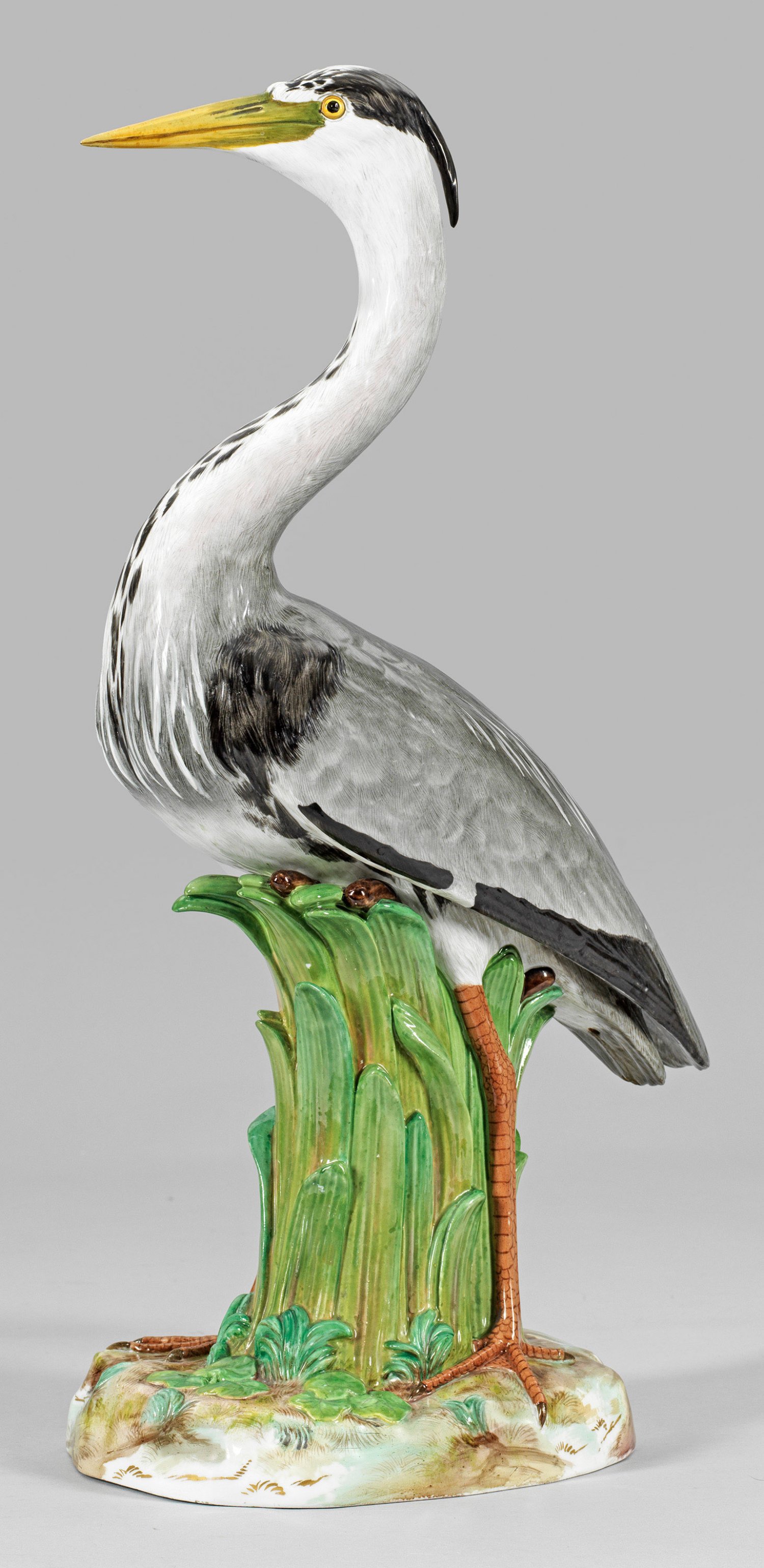 Auf einem mit Seerosenblättern reliefiertem Natursockel, zwischen emporragendem Schilf, stehender Fischreiher (bzw. Graureiher) mit langen Stelzenbeinen. Leicht reliefiertes Gefieder und naturalistische Staffierung des Federkleides sowie der Augen- und Kopfpartie. Polychrome Malerei mit Goldakzentuierung. Entw. Ernst August Leuteritz, um 1850. Modell-Nr. Z 57. Haarriss. Minim. rest.; Schwertermarke. H. 57 cm.