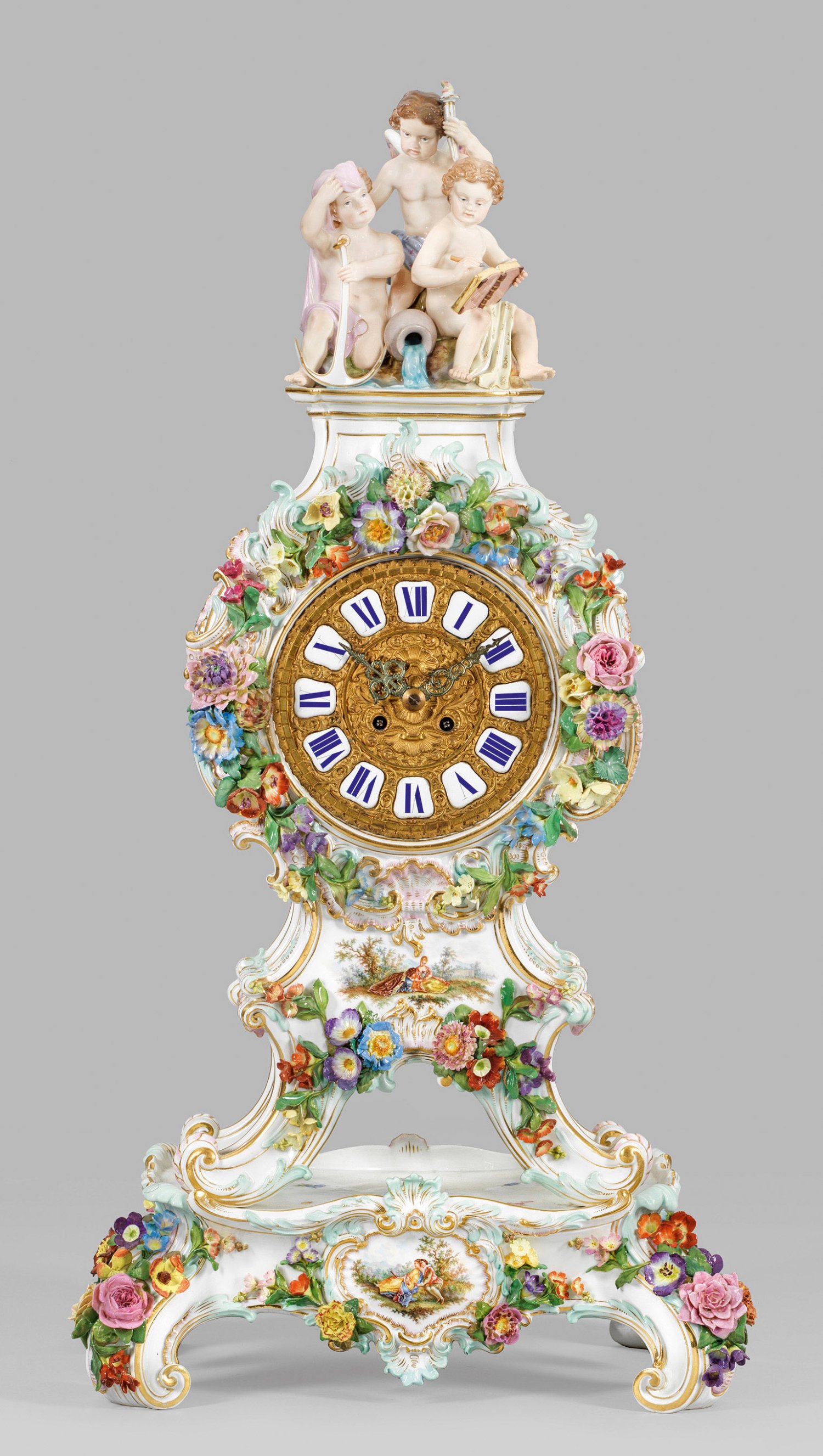 auf Sockel. 2-tlg.; Geschweifter, von vier kräftigen Rocaillefüßen getragener, rechteckiger Sockel mit plastischem Blumenbelag. Volutenförmig reliefierter Uhrenkorpus in Balusterform mit architektonisch anmutendem, profiliertem Abschluss, umzogen von fein modellierten, aufgelegten Blumenranken, reliefierten Rocaillen sowie Muschel- und Schuppenwerk. Als figürliche Bekrönung eine vollplastisch gearbeitete Gruppe von drei Putten auf felsigem Terrain mit großem Anker, Fackel bzw. Buch und Stift. Zwischen ihnen liegende Amphore, aus der Wasser fließt. Korpus und Sockel mit feinen Watteauszenen sowie farbenfrohem Blumenbukett und Streublumendekor. Polychrome Malerei mit reicher Goldstaffage. Rundes, floral und muschelförmig reliefiertes Zifferblatt aus Messing mit römischen Emailziffern. Halbstundenschlag auf Glocke. Platine bez. "Lenzkirch AGU" mit Serien-Nr. 387654. Entw. Ernst August Leuteritz, um 1880 - 1882. Unw. rest./best.; Schwertermarke. Uhren-H. 66 cm. Ges-H. 77 cm.