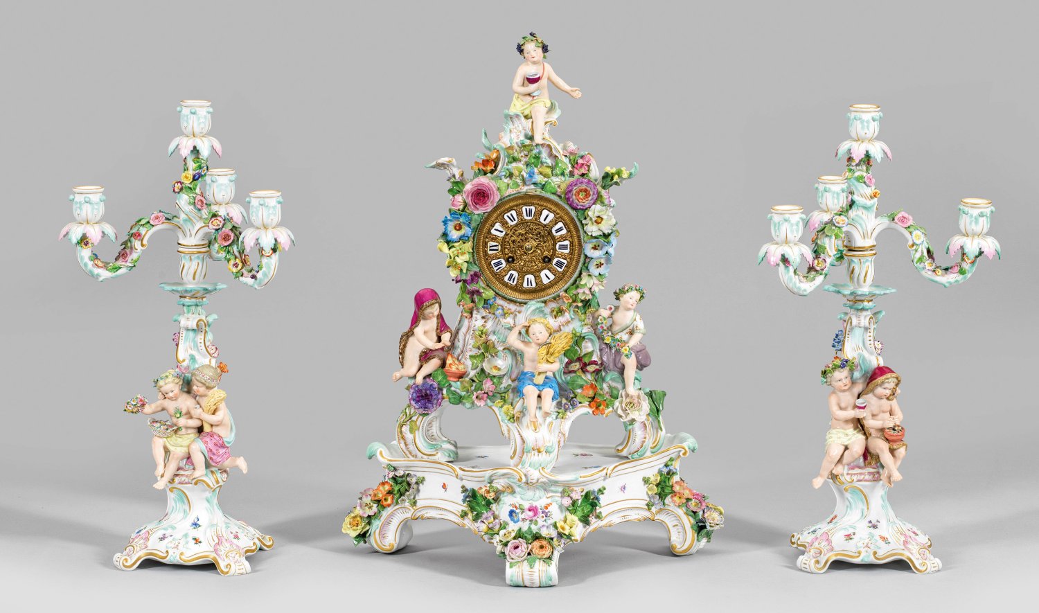 A splendid 4-piece ensemble of a mantel clock on base and a pair of candelabra with figural decoration of cupids as allegories of the four seasons, applied flower branches, polychrome painted flower bouquets. Insignificantly restored. Crossed swords mark.