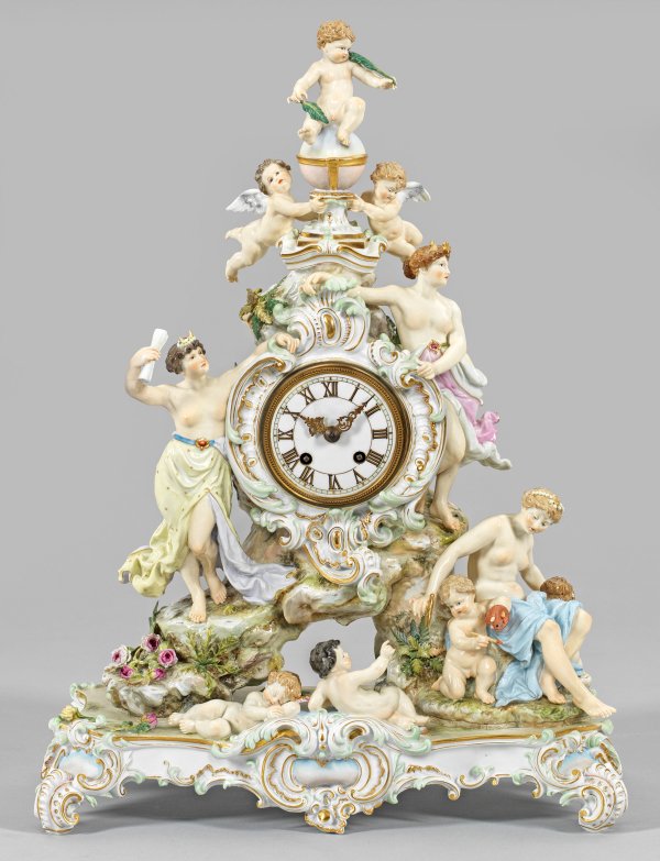 Geschweifter Rechtecksockel auf Rocaillefüßen, darüber balusterartig, in naturalistischer Felsformation aufsteigender Uhrenkorpus mit plastischen Rosen- und Efeuranken sowie Blattwerk. Als Bekrönung ein, von einem Putto mit Palmblättern über einem von zwei Amoretten gehaltenen Postament mit Erdkugel sitzend. Schauseitig auf unterschiedlichen Ebenen gestaltete Putten und allegorische Figuren in antikisierenden Gewändern. Unterhalb liegende Amoretten unweit einer jungen, einen Zirkel haltenden Dame mit perlengeschmückter Haartracht, begleitet von Putten mit Pinsel und Farbpalette bzw. Schreibtafel als Allegorie der Künste. Mittig zwei junge Damen in antikisierendem Gewand mit Schriftrolle und Mondsichel- bzw. Diadembekrönung. Von großer Kartusche gerahmtes Porzellan-Zifferblatt mit römischen, goldenen, schwarz konturierten Zahlen. Polychrome Malerei, mintgrüne und zartrosafarbene Staffierung mit reicher Goldstaffage. Halbstundenschlag auf Glocke. Platine bez. "Gustav Becker Freiburg". Entw. Johann Christian Hirt, 1886. Modell-Nr. N 200. Unw. rest.; Schwertermarke. H. 46 cm.