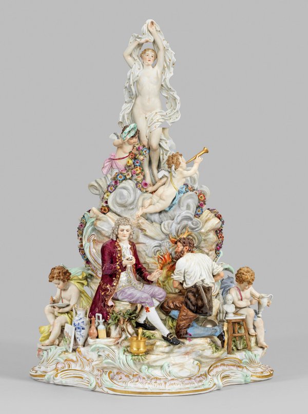 2-tlg. montiert. Dreiseitig geschweifter, von reliefplastischen Rocaillen umzogener, ansteigender Felssockel mit vollplastischer Komposition. Schauseitige, szenische Darstellung des sitzenden Johann Friedrich Böttger in eleganter Rokoko-Kleidung mit purpufarbenem, goldverziertem Rock über geblümter Weste und weißem Hemd sowie fliederfarbener Hose, die kleine Porzellanvase in seiner rechten Hand betrachtend. Seitlich, am offenen Brennofen kniender Schmied, mit einem Blasebalg das Feuer entfachend. Zu ihren Füßen liegende Schmiedezange bzw. stehender goldener Mörser sowie Elexierflaschen. Zur linken Seite sitzender Putto beim Bemalen eines Porzellantellers mit Zwiebelmusterdekor, unweit eine große Doppelhenkelvase mit Blumendekor sowie eine Ansichtentafel von Meissen stehend. Zur rechten Seite sitzender Putto als Bossierer. Neben ihm, auf einem Holzhocker stehende Kinderbüste der Prinzessin Marie Zephirine de Bourbon sowie liegendes Werkzeug. Als Bekrönung eine über Wolken schwebende, allegorische Frauengestalt mit aufgeplustertem Tuch, umgeben von Putten mit Blumengirlanden, Lorbeerkranz bzw. Posaune. Polychrome Malerei mit reicher Goldstaffage. Entw. Paul Helmig, 1859. Modell-Nr. O 168. Schwertermarke. Ges.-H. 46 cm.