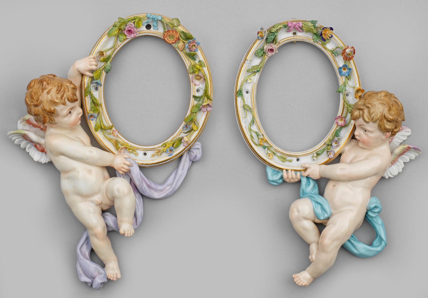 als Gegenstücke. Vollplastisch gearbeiteter, rücks. abgeflachter Putto mit fliederfarbenem bzw. hellblauem Tuch, einen ovalem Profilrahmen mit plastisch aufgelegten Blumenranken haltend. Polychrome Malerei mit Goldstaffage. Entw. Johannes Daniel Schreitmüller, 1880. Modell-Nr. L 192 und L 193. Ohne Spiegelglas. Unw. best./rest.; Schwertermarke. H. 24 cm.