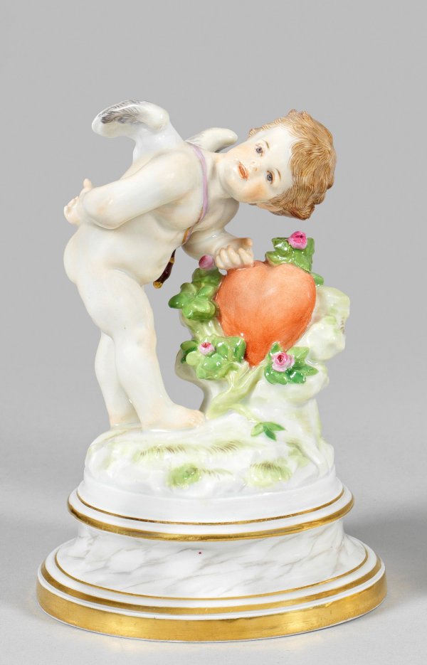 Auf profiliertem, marmoriertem Rundsockel mit felsigem Terrain stehender, sich vorbeugender Amor, an ein großes, von Rosenranken umzogenes Herz klopfend und auf Antwort lauschend. Polychrome Malerei mit Goldstaffage. Entw. Heinrich Schwabe. Modell-Nr. L 121. Rest.; Schwertermarke. H. 15,5 cm.
