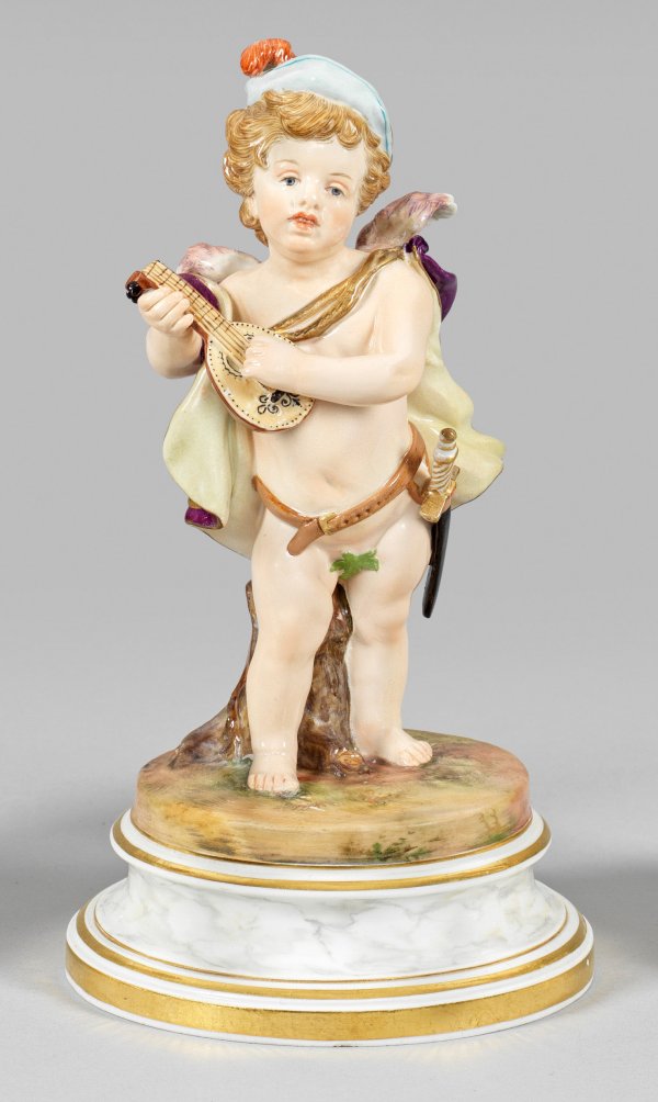 Auf profiliertem, marmorierten Rundsockel mit naturalistischem Terrain stehender Amor mit Federkappe und Umhang, die Laute spielend. Polychrome Malerei mit Goldstaffage. Entw. Heinrich Schwabe. Modell-Nr. L 124. Rest.; Schwertermarke. H. 19,5 cm.