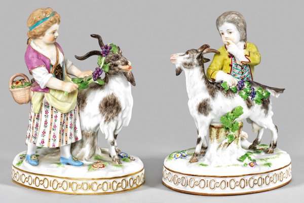 Auf ovalem Terrainsockel mit reliefierter Ornamentbordüre stehendes Mädchen bzw. Knabe, einen Ziegenbock mit einer Weinlaubgirlande schmückend. Polychrome Malerei mit Goldstaffage. Entw. Johann Carl Schönheit. Modell-Nr. H 81, H 82. Minim. rest.; Teilw. minim. best.; Schwertermarke. H. 14,5 - 15 cm.