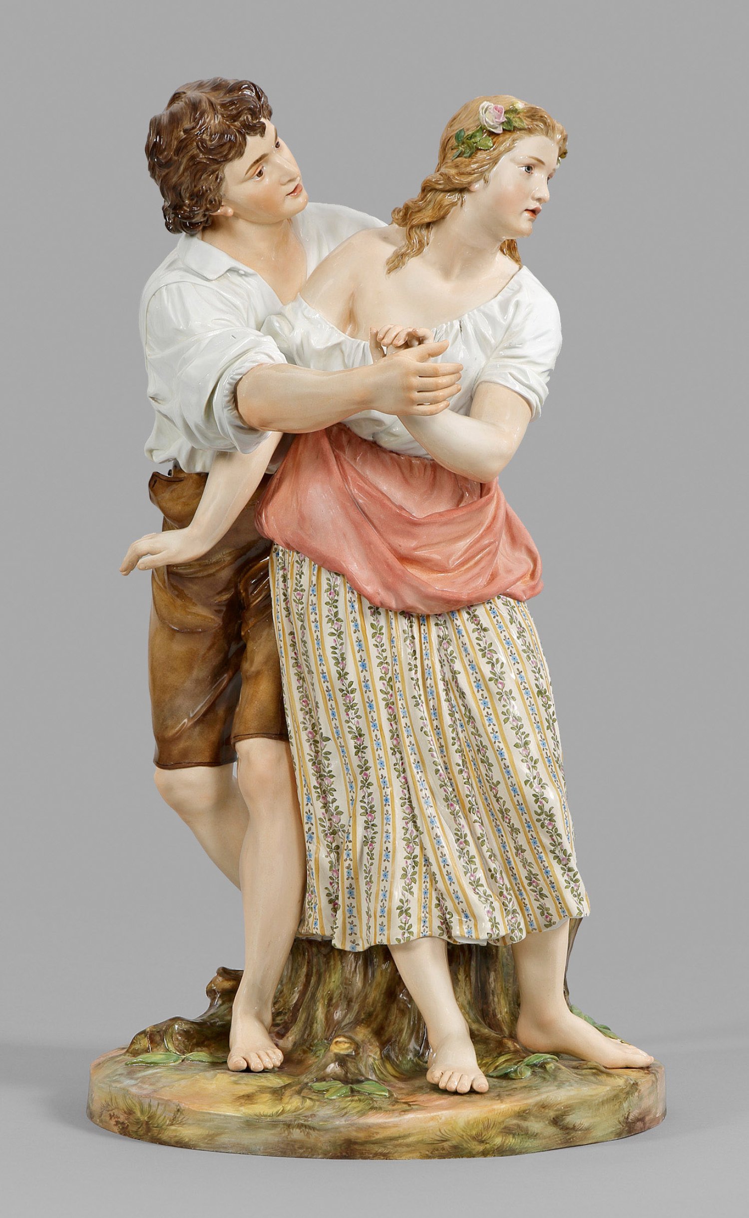Auf naturalistisch staffiertem Sockel stehendes Paar in ländlicher Kleidung. Das Mädchen mit weißer Bluse und apricotfarbener Schürze über gestreiftem, geblümtem Rock, das hellbraune Haar von einem Rosenzweig geschmückt. Hinter ihr stehender, junger Mann in knielanger, brauner Hose und weißem Hemd beim Versuch, sich dem Mädchen zu nähern, während sie sich von ihm abwendet. Polychrome Malerei. Entw. Johann Christian Hirt, 1882. Modell-Nr. M 169. Minim. best./rest.; Schwertermarke. H. 57 cm.
