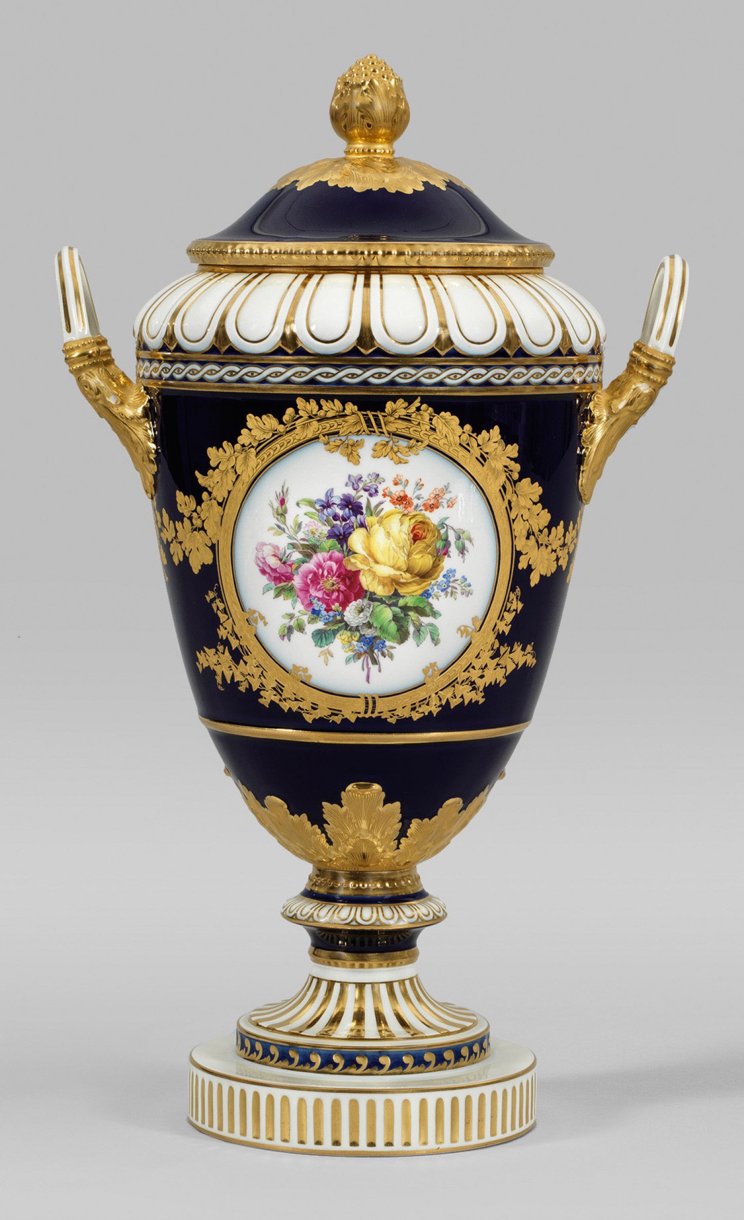 sog. "Weimar-Vase". Über gestuftem Rundfuß ovoider Korpus mit Reliefornamentfriesen aus Wellen- und Flechtband, Stab-, Perl- und Zungenfries. Seitliche, aus Akanthusblattreliefs hochgezogene, kannelierte Handhaben. Korrespondierender, gewölbter Deckel mit plastischem Knospenknauf über Blattrosette. Beidseitig der Wandung in kobaltblauem Fond ausgesparte Medaillonrahmung aus einer fein radierten, von Eichenlaub- und Efeuranken umzogenen Ornamentbordüre. Darin, auf weißem Fond, farbenprächtige Blumenarrangements, u. a. aus Rosen, Chrysanthemen, Tulpen, Pfingstrosen und Vergissmeinnicht. Äußerst feine polychrome Malerei mit reicher radierter Goldstaffage. Zepter- und Malereimarke. H. 44,5 cm.