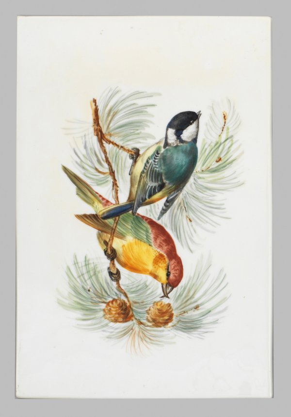 Hochrechteckige Bildplatte mit Darstellung von zwei Vögeln auf einem Kieferzweig in polychromer Malerei (später). Press-Nr. 237-158. Eingepresste Zepter- und KPM-Marke. 24 cm x 16 cm.