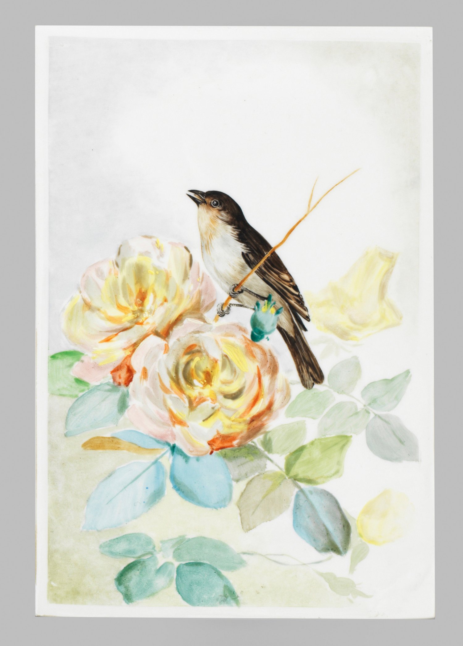 Hochrechteckige Bildplatte mit sommerlichen Pfingsrosenzweigen und sitzendem, heimischen Vogel in polychromer, lasierend aufgetragener Malerei (später). Ritz-Nr. 237-158. Jahreszeichen. Eingepresste Zepter- und KPM-Marke. 23,5 cm x 16,5 cm.