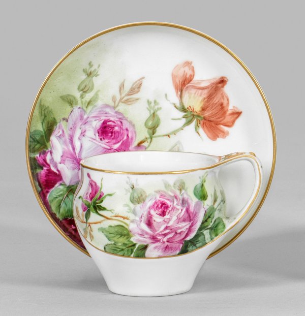 Leicht gebauchter, runder Korpus, seitlich bandartig ausgezogener, oberhalb durchbrochen gearbeiteter Henkel mit floralem Relief. Beidseitig der Wandung farbenfrohes Rosenmotiv in weicher, polychromer Malerei auf pastellgrünem Fond (später). Goldrand. Korrespondierender Rosendekor im Spiegel der Untertasse. Form-Entw. Paul Schley, 1901. Maler-Monogr. "G.W.". Zeptermarke. H. 7 cm.