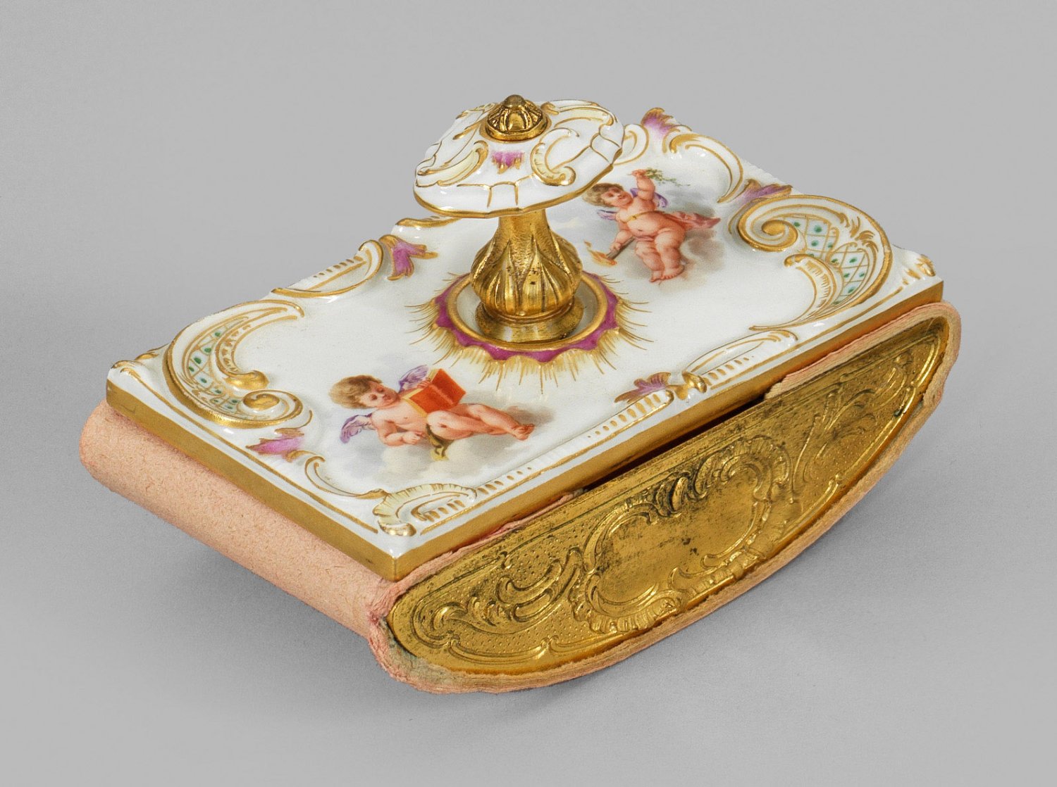 aus einer Damenschreibgarnitur. Porzellan, vergoldete Bronze und Pappe. Rechteckige Porzellanplatte mit balusterförmigem Knauf über gerundetem, rocailleverziertem Unterteil. Rocaillerelief- sowie Puttendekor. Polychrome Malerei mit reicher Goldstaffage. Entw. KPM-Werkstatt. H. 7,5 cm. 12 cm x 7 cm.