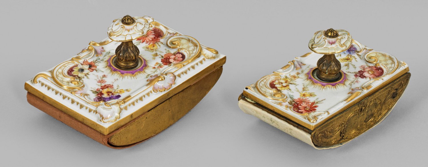 aus einer Damenschreibgarnitur. Porzellan, vergoldete Bronze und Pappe. Rechteckige Porzellanplatte mit balusterförmigem Knauf über gerundetem, rocailleverziertem Unterteil. Teilw. zartgelb staffierter Rocaillereliefdekor sowie feiner Blumendekor in sog. Weichmalerei, akzentuiert durch Weißhöhungen. Reiche Goldstaffage. Entw. KPM-Werkstatt. H. 7,5 cm. 12 cm x 7 cm.