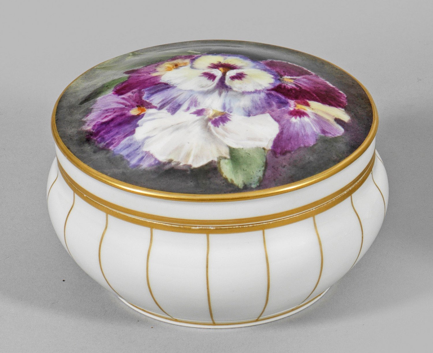Runder, leicht gebauchter Korpus. Auf dem gewölbten Deckel ein farbenprächtiges Arrangement aus Stiefmütterchen auf grau-grün changierendem Fond in weicher, polychromer Malerei. Vertikaler Goldliniendekor. Form-Entw. KPM-Werkstatt. Zeptermarke. H. 8 cm. Korpus-D. 11,5 cm.