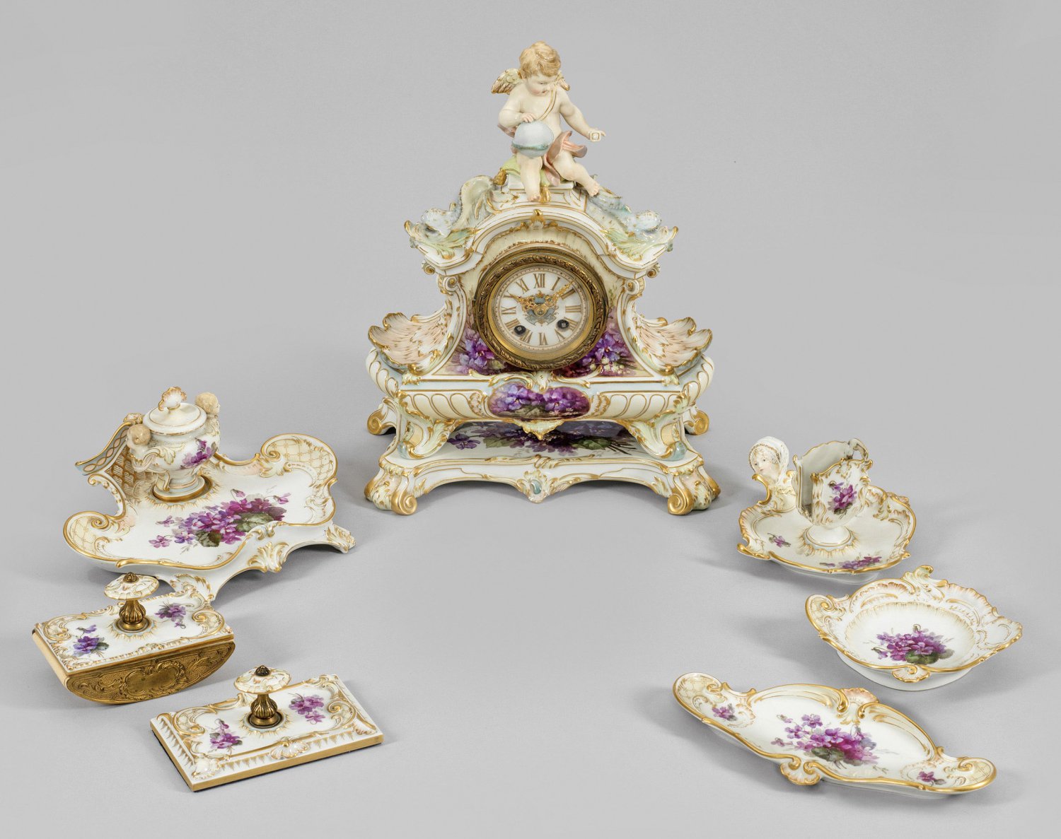 8-tlg.; Kaminuhr mit Sockel, Tintengefäß, Löschwiege, Streusandschale, Federschale, Streichholzhalter, Briefbeschwerer. Von vier Blattvoluten getragener, godronierter Uhrenkorpus mit seitlich aufsteigenden Muschelreliefs und architektonischem, bogenförmigem Giebelabschluss. Als Bekrönung sitzender Putto mit schlangenumwundener Weltkugel und Sanduhr als Symbol der Vergänglichkeit, flankiert von aufgelegten Delphinen. Die Schreibgarnitur aus rocailleförmig geschwungenen, gemuldeten sowie rechteckigen Formen. Reicher reliefplastischer Dekor aus Rocaillen, Kartuschen, Voluten, Muscheln, Delphinen sowie plastischen Engelsköpfen, partiell umzogen von Gitterfonds und Ornamentik. Auf den Wandungen teilw. in Kartuschen und Zwickeln gefasste Blumenarrangements aus blauvioletten Veilchen, teilw. begleitet von Maiglöckchen und Vergissmeinnicht bzw. Heckenrosen in pastelliger, sog. Weichmalerei. Umlaufend farbige Staffierungen in zarten Grün-, Blau-, Apricot- und Ockertönen mit Goldstaffage. Malerbuchstabe W. In Braun (unbekannt) sowie M. in Rot für Fritz Maeder (tätig als Blumenmaler ab 1910). Schreibgarnitur-Entw. 1882 - 1885. Uhrenform-Entw. Paul Schley. Rundes, verglastes Porzellanzifferblatt mit goldenen, römischen Zahlen. Messingwerk mit Schlag auf Glocke, bez. "Gustav Becker/Freiburg". Minim. Besch.; Zepter- und Malereimarke. Uhren-H. 29,5 cm. 6 cm - 16 cm x 13,5 cm - 24 cm.
