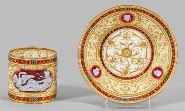 Zylindrischer Korpus mit gerundetem, vergoldetem Ohrenhenkel. Auf der Wandung, im Spiegel und auf der ansteigenden Fahne reicher, feinliniger Reliefgolddekor aus umlaufenden, arabesken Rankenbändern und Ornamentbordüren auf hellgelben, eisenroten und tannengrünen Fondflächen. Ausgesparte, ornamental gerahmte Ovalreserven und Medaillons mit antikisierenden Darstellungen in weißer Pâte-sur-pâte-Malerei auf weinrotem und framboisefarbenem Grund. Auf der Schauseite erhabene Darstellung der liegenden Leda in Begleitung eines Schwans, flankiert von ovalen Puttenmotiven. Auf der Fahne antikisierende Frauenköpfe. Goldornamentbordüre sowie korrespondierende Reliefgoldverzierungen auf der Außenwandung der Untertasse. Malerzeichen in Gold. Zepter- und Malereimarke. H. 4,5 cm.