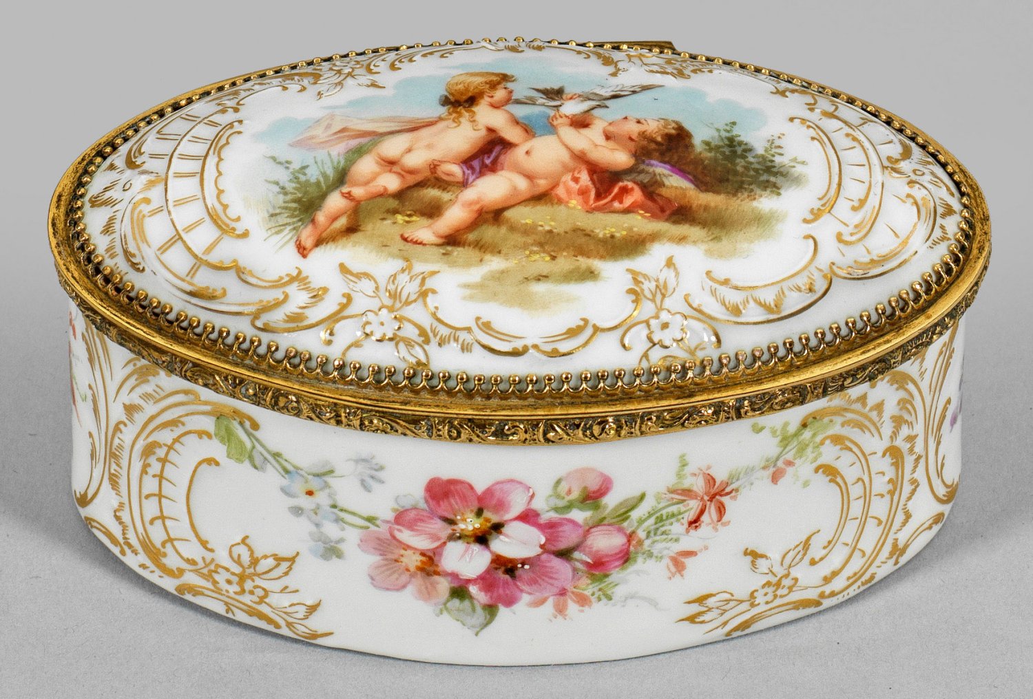 Porzellan. Ovaler Korpus mit leicht gehöhtem Scharnierdeckel. Allseitig reliefierter, goldstaffierter Rocailledekor aus Spaliergittern und Blütenzweigen als Rahmung für feine Blumenbuketts sowie spielende Amoretten mit Taube nach François Boucher. Korrespondierender Blumendekor auf der Deckelinnenseite sowie feinliniger Goldrankendekor auf der Innenwandung. Pastelltonige, teilw. weißgehöhte Weichmalerei. Floral reliefierte, vergoldete Metallmontierung. Zepter- und Malereimarke. H. 5 cm. L. 9,5 cm.