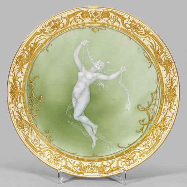 Runde, flach gemuldete Form mit glattem Rand. Im Spiegel goldgerahmte Medaillonreserve mit antikisierender Darstellung einer schwebenden Nymphe mit hauchdünnem Schleier, oberhalb ihres Kopfes ein strahlender Stern. Weiße, äußerst feine, reliefartig aufgetragene Pâte-sur-Pâte-Malerei auf limonengrünem Glasurfond. Umlaufende Randbordüre mit reicher Reliefgoldornamentik aus erhabenem Laub- und Bandelwerk auf zartgelben und akzentuierten, roséfarbenen Fondflächen. Glasurkrakelee. Zepter- und Malereimarke. D. 35 cm.