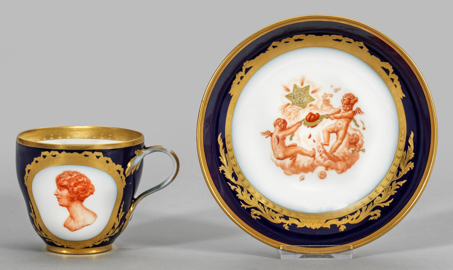 auf Untertasse. Beidseitig der Wandung, in kobaltblauem Fond ausgesparte Goldornamentreserve mit Damen- bzw. Herrenbildnis im Profil. Im Spiegel zwei in Wolken schwebenden Amoretten, gemeinsam zwei Herzen zusammenschnürend. Darüber goldener Stern mit Datum "22.3.1928". Äußerst feine, eisenrote Camaieumalerei von Willy Papenfuss auf weißem Grund. Teilw. radierter Golddekor. Im Boden Maler-Sign.; Zeptermarke. H. 6,5 cm.