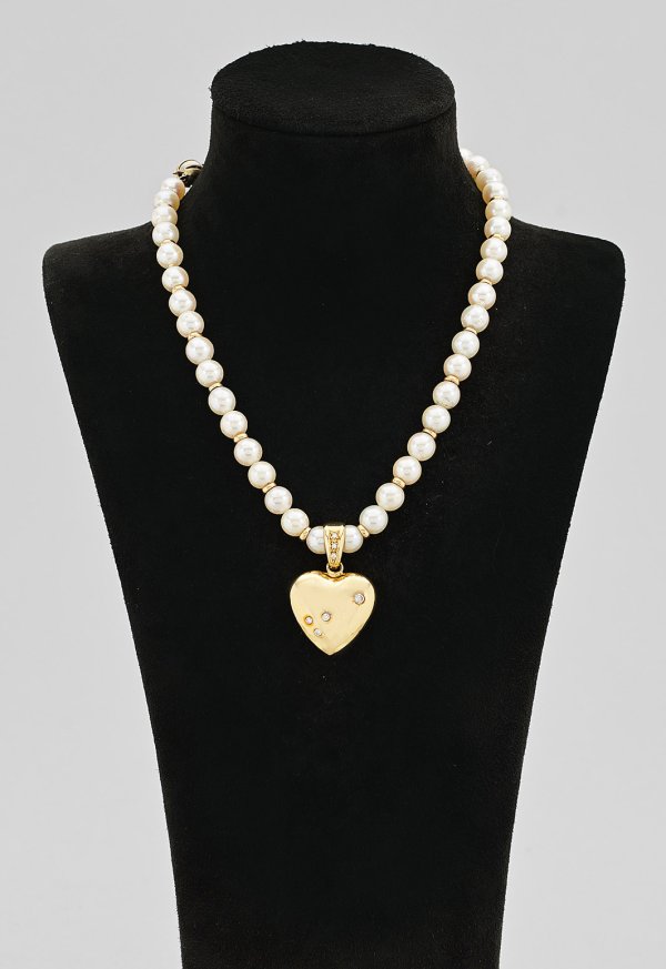 Gelbgold, gest. 585. Einreihige Kette aus cremefarbenen Zuchtperlen von ca. 7,1 mm in sehr farbintensivem, rosé-grün changierendem Lüster. Abschließender Herzanhänger, besetzt mit Brillanten von zus. ca. 0,30 ct.