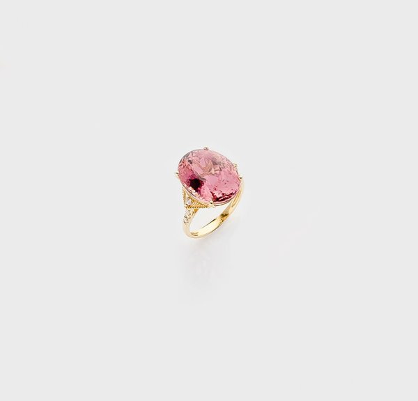 Gelbgold, gest. 14 ct.; Zentral besetzt mit einem apricotfarbenem Morganit von ca. 15 ct., flankiert von kleinen Diamanten von zus. ca. 0,12 ct.; Gew. ca. 6,24 g.
