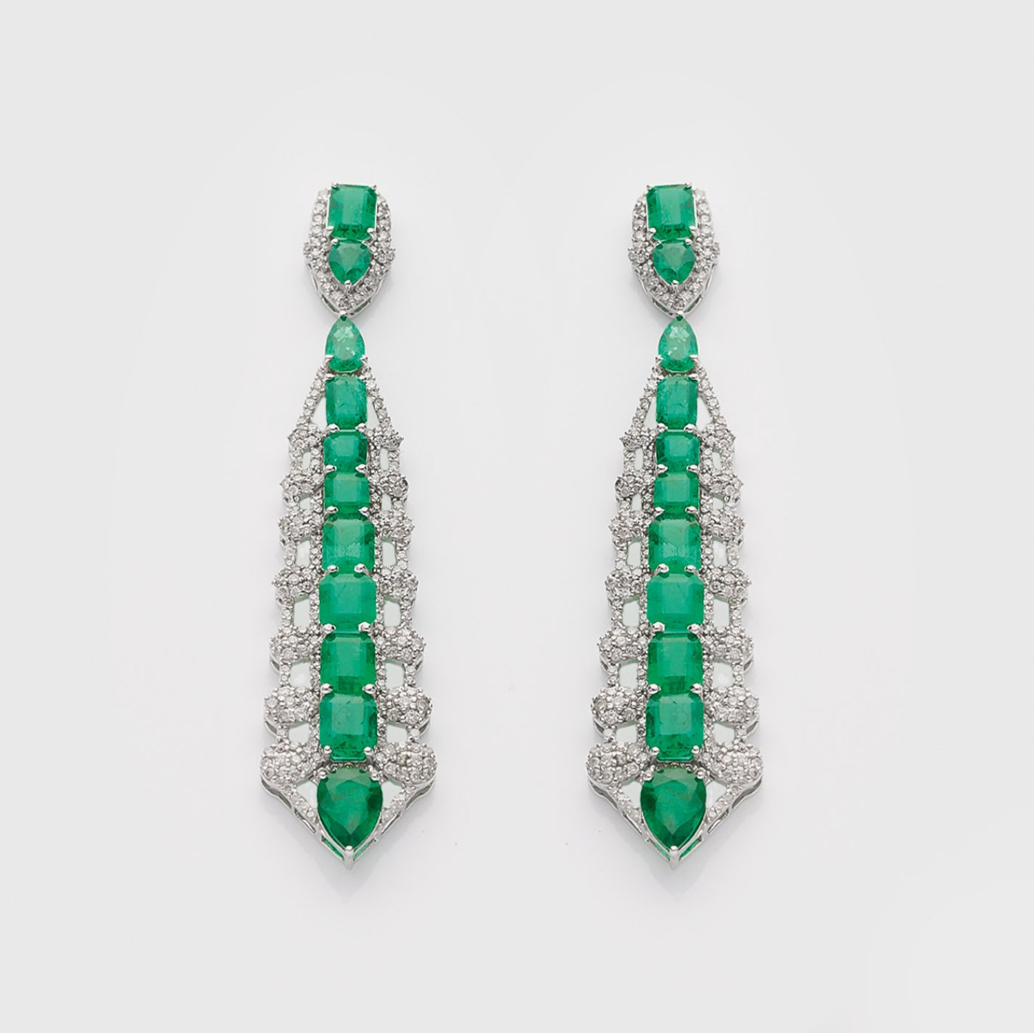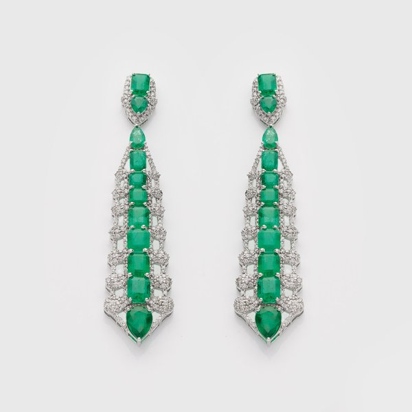 Pair of earrings set with Zambia emeralds approx. 13,77 ct. and diamonds approx. 2,40 ct., in 18 k white gold.
