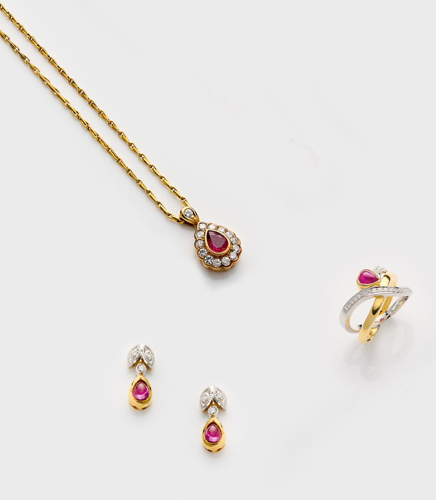 Ring, Paar Ohrringe und Anhänger mit Kette. Gelb- und Weißgold, gest. 585 und 750. Besetzt mit taubenblutroten Rubinen von zus. ca. 2,50 ct., entouriert von Brillanten von zus. ca. 0,21 ct. (vvsi/w) bzw. 0,56 ct. (si/w). Ges.-Gew. ca. 20,40 g.