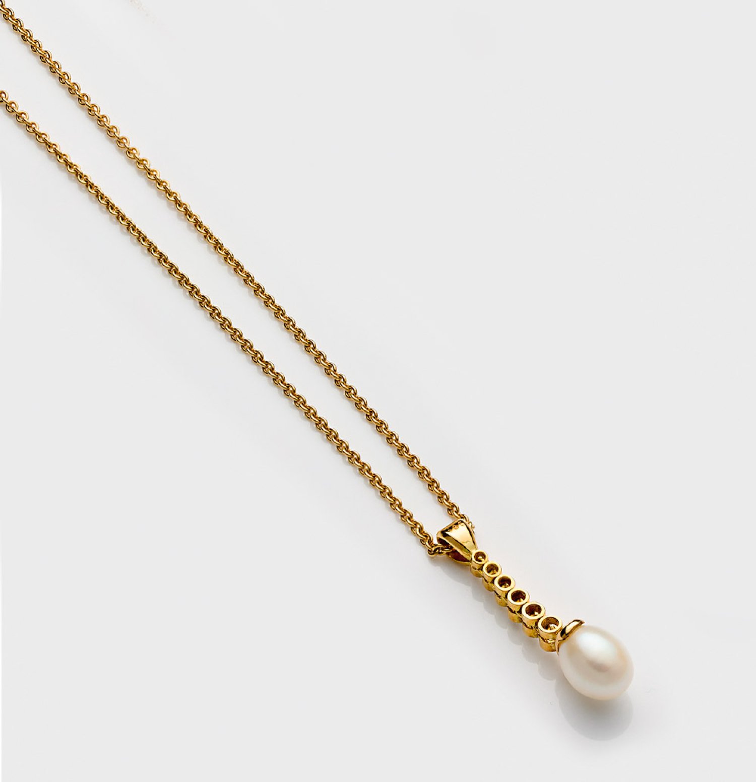 Pendant set with a South Sea pearl and diamonds approx. 0,24 ct. (p/w), in 14 k gold. Necklace in 18 k gold.