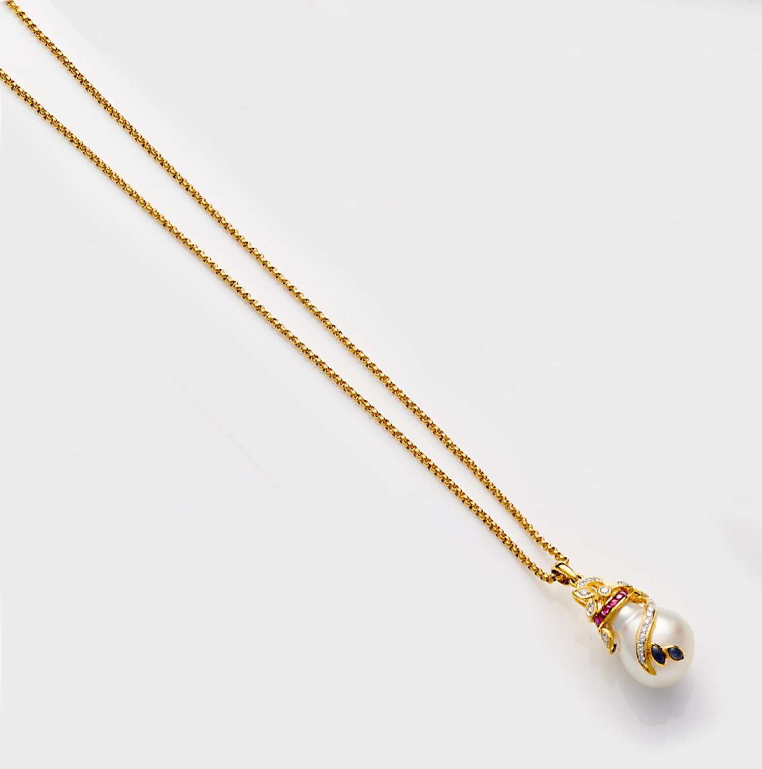 Gelbgold, gest. 750. Besetzt mit einem silberweißen Südseeperltropfen von ca. 13 mm in farbintensivem, rosé-grün changierendem Lüster, Saphiren und Rubinen von zus. ca. 0,47 ct. sowie Diamanten von zus. ca. 0,17 ct. (vvsi/w). Feine Rundankerkette. Ges.-Gew. ca. 11,34 g.