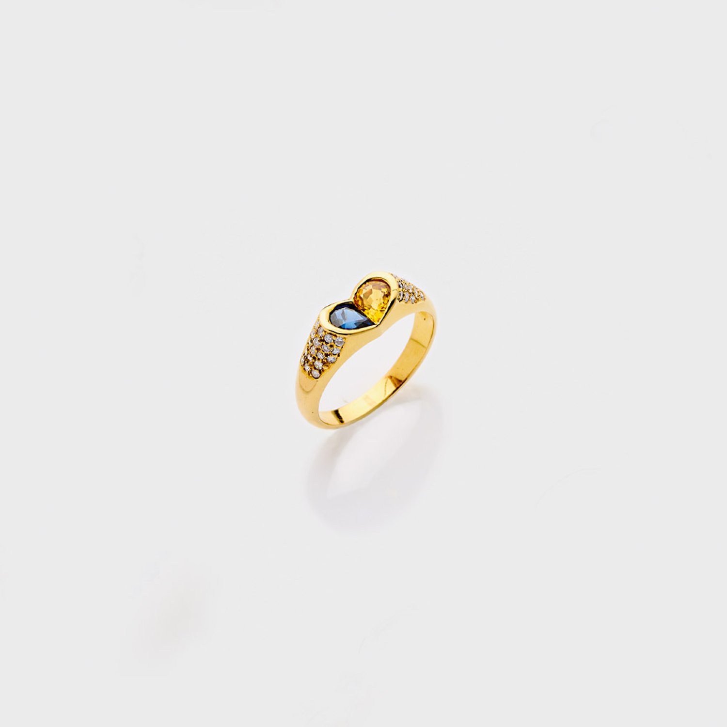Ring set with a blue sapphire approx. 0,55 ct., a yellow sapphire approx. 0,54 ct. and diamonds approx. 0,27 ct. (p/w), in 18 k gold.