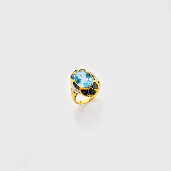 Gelbgold, gest. 750. Zentral besetzt mit einem Blautopas mit Liliengravur, akzentuiert durch tintenblaue Saphire von zus. ca. 1,60 ct. und Diamanten von zus. ca. 0,12 ct. (vvsi/w). Gew. ca. 7,33 g.