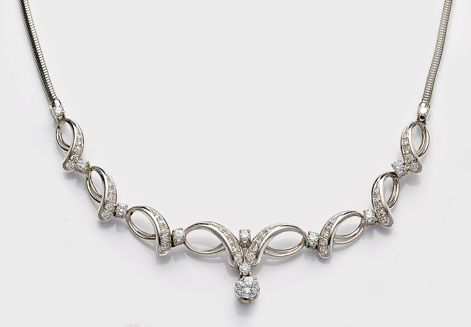 Necklace set with a brilliant solitaire approx. 0,65 ct. (F-G/vvs) and 52 brilliants approx. 1,87 ct. (F-G/vvs), in 18 k white gold. Certificate included.