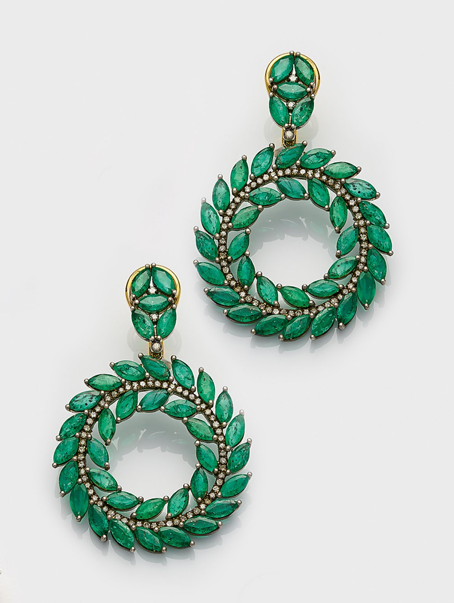 Lot 1100: Paar russische Smaragd-Diamant-Ohrgehänge