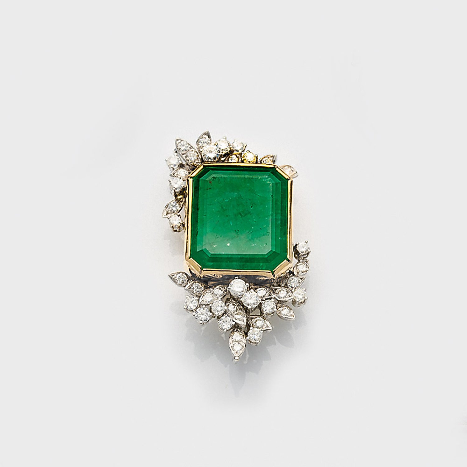 Gelb- und Weißgold, gest. 750. Zentral besetzt mit einem Smaragd von ca. 30 ct., akzentuiert durch 39 Brillanten von zus. ca. 3,00 ct. (F-G/vsi-si). Auch als Anhänger tragbar. Gew. ca. 25,96 g.
