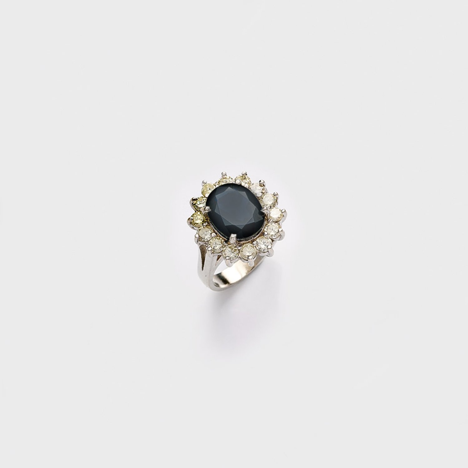 Weißgold, gest. 750. Zentral besetzt mit einem Saphir von ca. 11,6 mm x 9,1 mm, entouriert von Brillanten von zus. ca. 1,69 ct.; Gew. ca. 13,03 g.