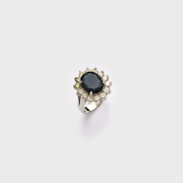 Ring set with a sapphire approx. 11,6 mm x 9,1 mm and diamonds approx. 1,69 ct., in 18 k gold.