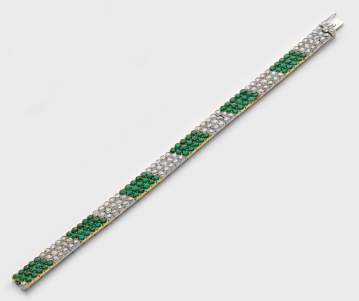 Platin. Schauseitig besetzt mit Altschliffdiamanten von zus. ca. 7,50 ct. (H/vs2-si2) und leuchtendgrünen Smaragden von zus. ca. 4,50 ct. im dekorativen Wechsel. Gew. ca. 25,99 g.