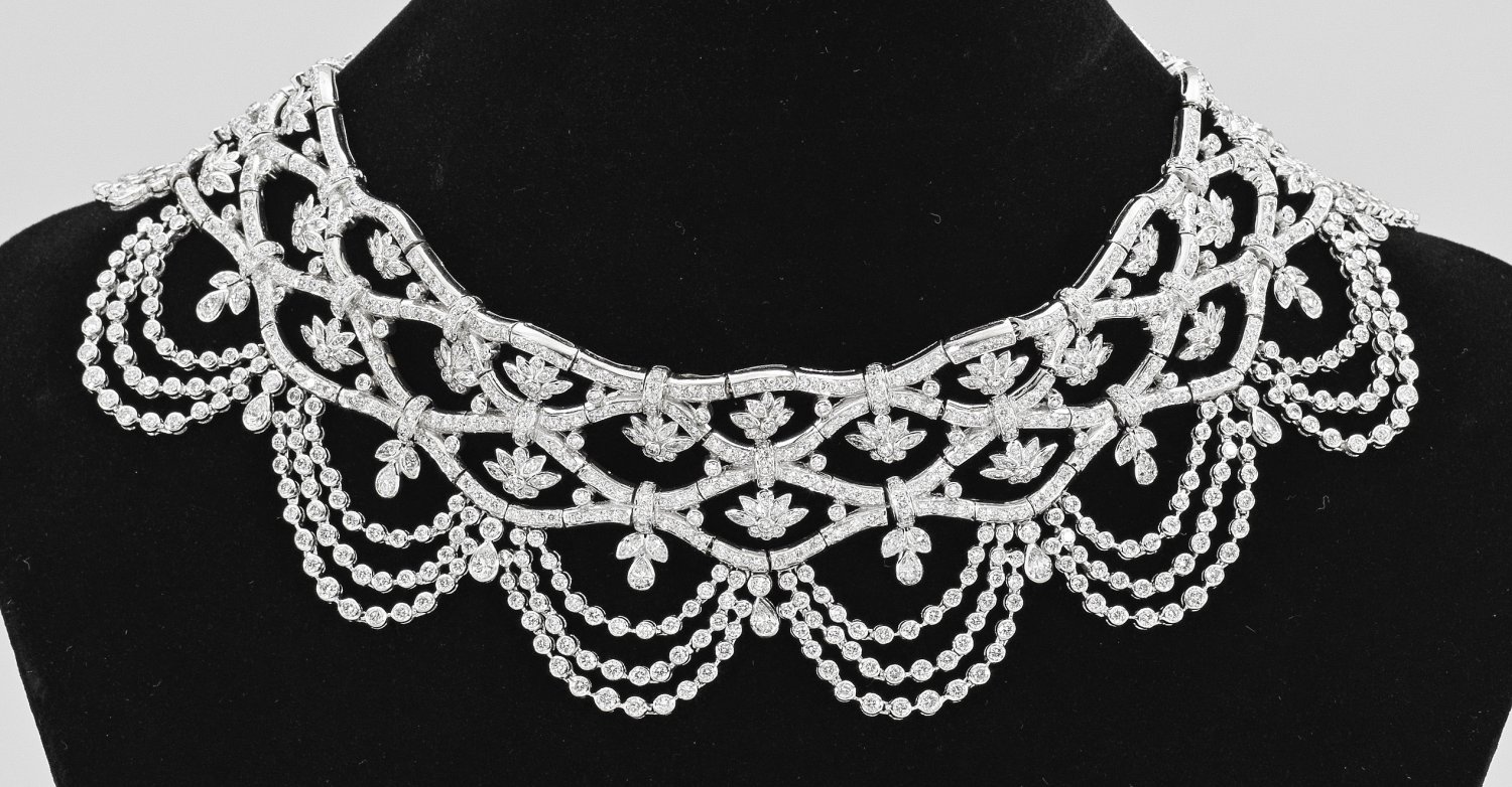 Weißgold, gest. 750. Ausgefasst mit 1872 Diamanten im Brillant-, Navette- und Pendeloqueschliff von zus. ca. 45 ct. (vs1-2/si1-2/pi1-2/H-J). Ges.-Gew. ca. 155,4 g. Sehr feine Goldschmiedeausführung in Ajour, im Haute Joaillerie-Stil von Chaumet, Paris.