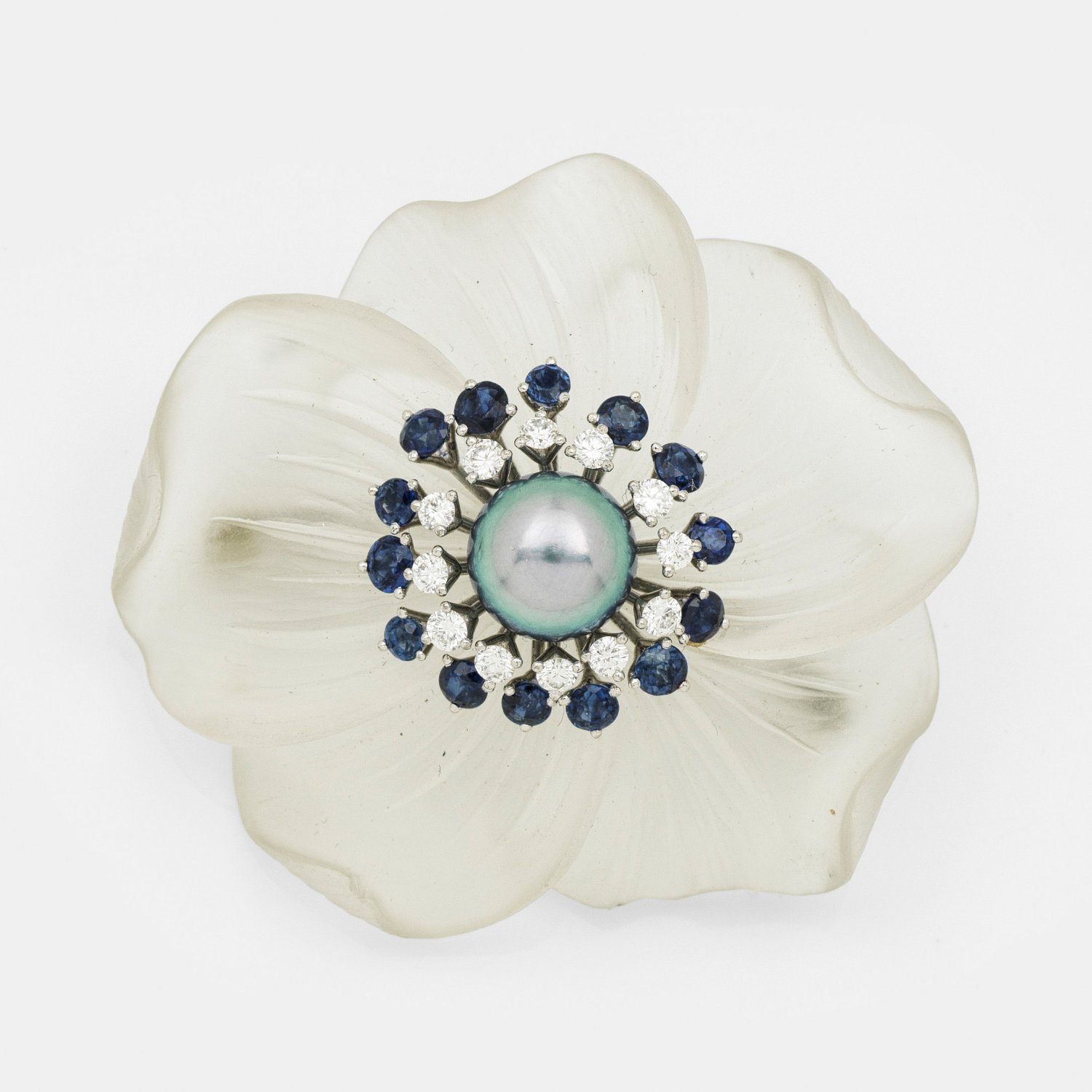 Weißgold, gest. 750. Dekorativ gestaltet in Form von Rosenblüten aus geschnittenem, satiniertem Glas. Zentral besetzt mit einer nahezu makellosen Tahitiperle von ca. 10 mm, in sehr farbintensivem, violet-grün changierendem Lüster sowie Brillanten von zus. ca. 0,60 ct. und kornblumenblauen Saphiren von zus. 1,30 ct.; Gew. ca. 26,60 g.