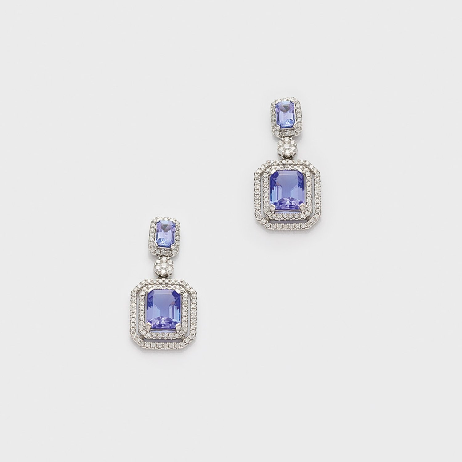 Pair of earrings set with blue violet tanzanites approx. 4,00 ct. and diamonds approx. 1,06 ct. (G-H/vs), in 18 k white gold.