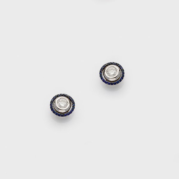 Pair of earrings set with 2 brilliant solitaires each approx. 0,70 ct. (G-H/vs) and small sapphires, in 18 k white gold.