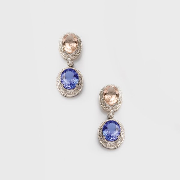 Pair of earrings set with tanzanites approx. 8,82 ct., morganites approx. 5,20 ct. and diamonds approx. 1,60 ct., in 18 k white gold.