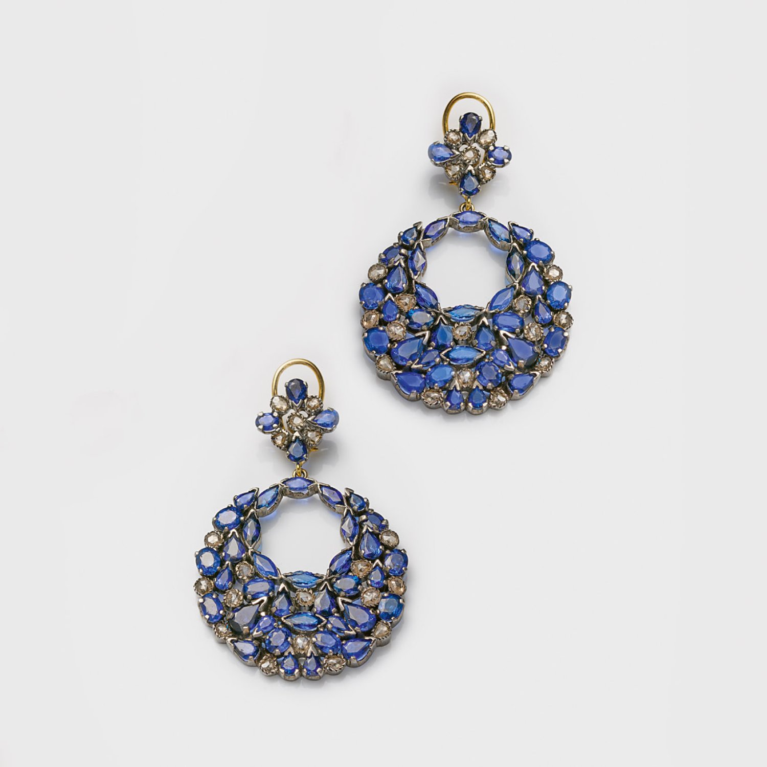 Pair of earrings set with nearly cornflower blue sapphires approx. 31,20 ct. and diamonds approx. 3,90 ct., in 14 k gold and silver.