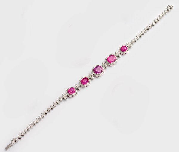 Bracelet set with diamonds approx. 2,20 ct. and pink purple sapphires (no indications of thermal treatment), in 18 k white gold. Certificate included.