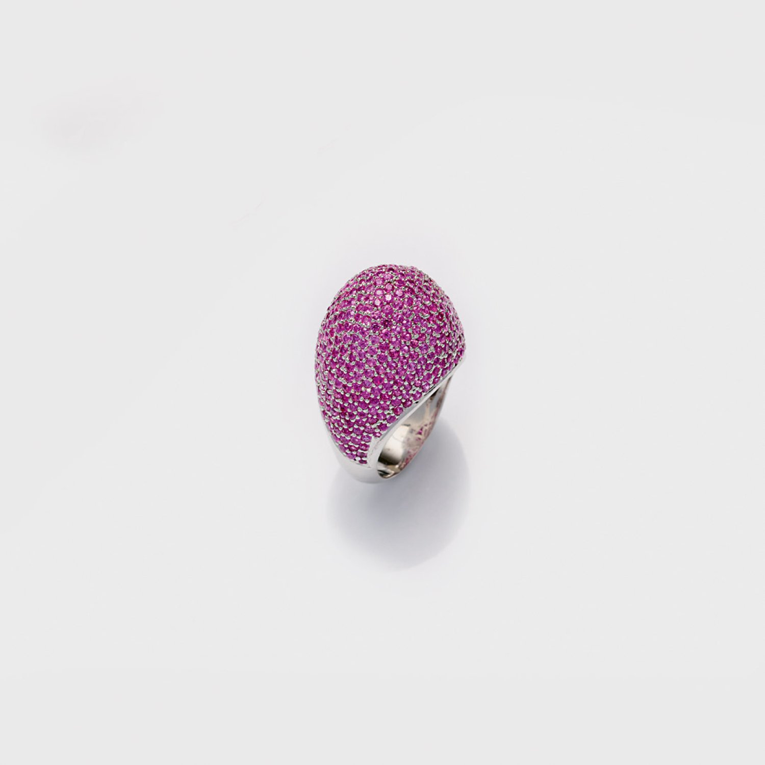 Weißgold, 18 ct.; Allseitig besetzt mit pinkfarbenen Saphiren von zus. ca. 4,64 ct. und Diamanten von zus. ca. 1,21 ct. in Pavéfassung. Gew. ca. 11,72 g.