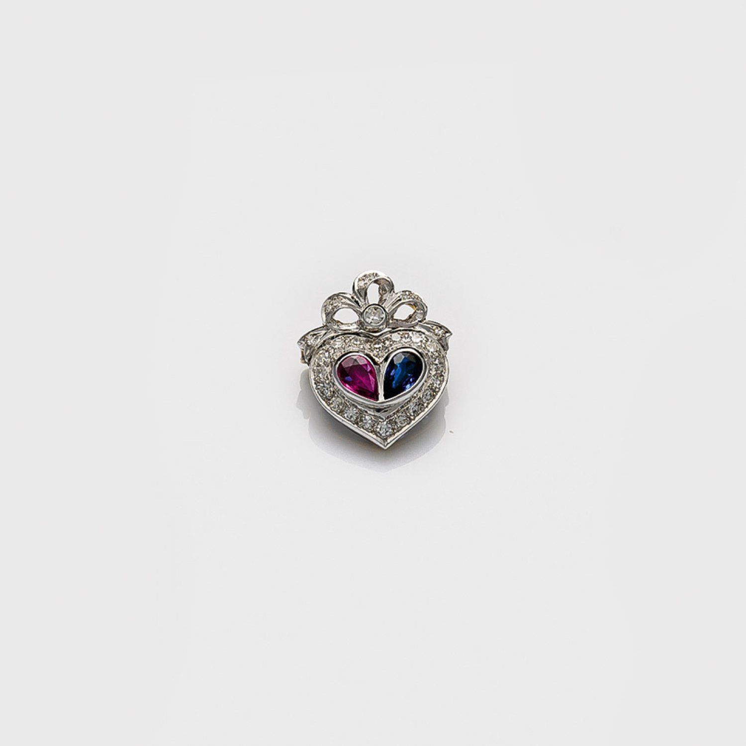 Gelbgold, gest. 585. Zentral besetzt mit einem Rubin- und einem Saphirtropfen von zus. ca. 0,51 ct., entouriert von Diamanten von zus. 0,30 ct. (vsi/w). Als Anhänger tragbar. Gew. ca. 3,06 g.