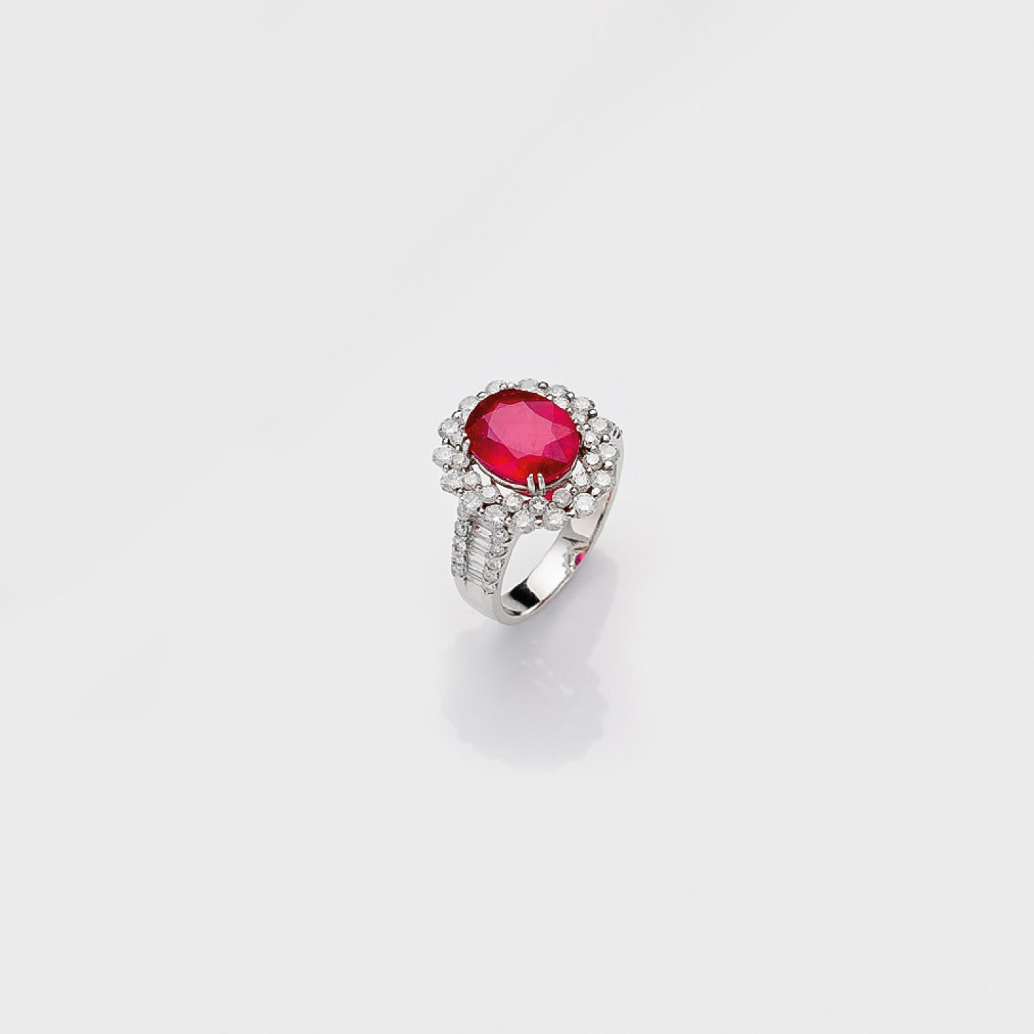 Weißgold, gest. 750. Zentral besetzt mit taubenblutrotem Rubin von ca. 4,90 ct., entouriert von Diamanten von zus. ca. 1,80 ct. (wesselton(H)/si-pi). Gew. ca. 7,04 g.